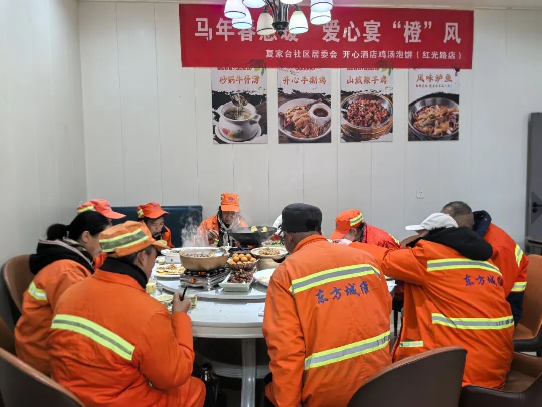 2月2日中午,清河口街道夏家台社区联合辖区红光路爱心餐饮企业“开心酒店”,共同举办“马年春意暖 爱心宴‘橙’风”活动,特意准备了两桌酒席,邀请辖区二十余名一线环卫工人欢聚一堂,提前吃上了一顿温馨热闹的团年饭。