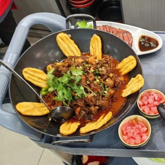 上午11点,餐厅内暖意融融,灯笼高挂,洋溢着浓厚的节日氛围。环卫工人们结束上午的工作后,陆续受邀入席。社区工作人员与餐厅员工早已精心布置好场地,备好了热气腾腾、香气扑鼻的丰盛菜肴。特色鸡汤泡饼、红烧鱼、暖胃羊排、粉蒸肉、平安四季……一道道寓意吉祥、营养可口的家常美食端上桌,传递着家一般的温暖与诚挚的敬意。